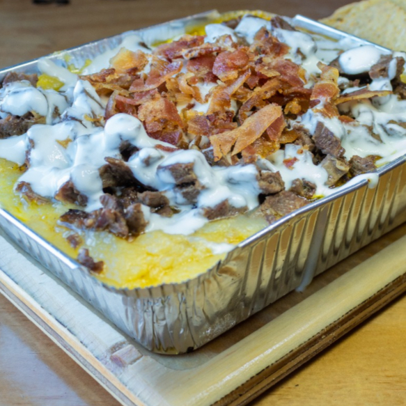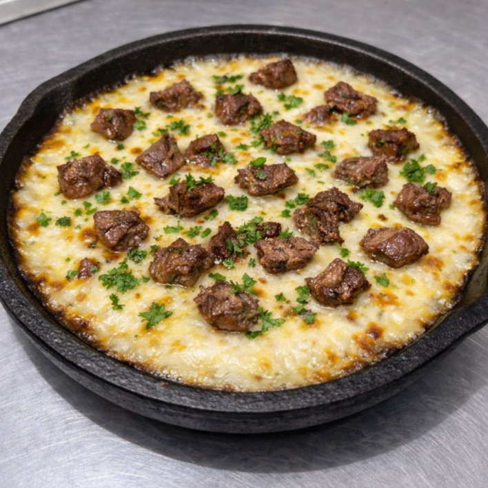 150g. de fajita de res acompañado de crema y tocino, gratinada con una mezcla de quesos.