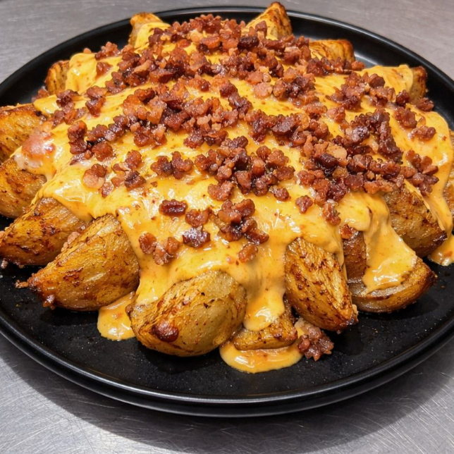 Papas gajo 250g, gratinadas con queso asadero y tocino, bañadas con queso amarillo para nachos.