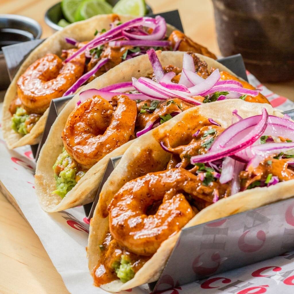 Camarones marinados en salsa de chipotle, con col morada, cebolla, guacamole y cilantro.