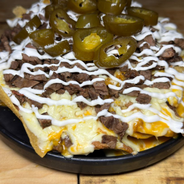 Totopos con una base de frijoles, queso para nachos, queso asadero, fajita de res, crema y jalapeños.