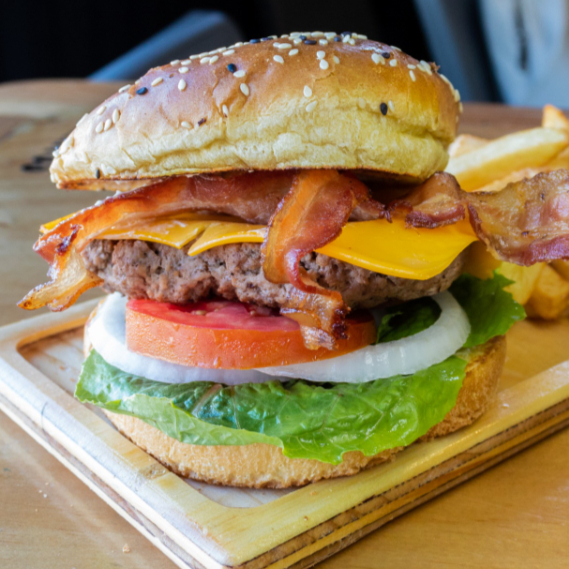 Deliciosa carne de res con queso amarillo, tocino, lechuga, tomate, cebolla y mayonesa