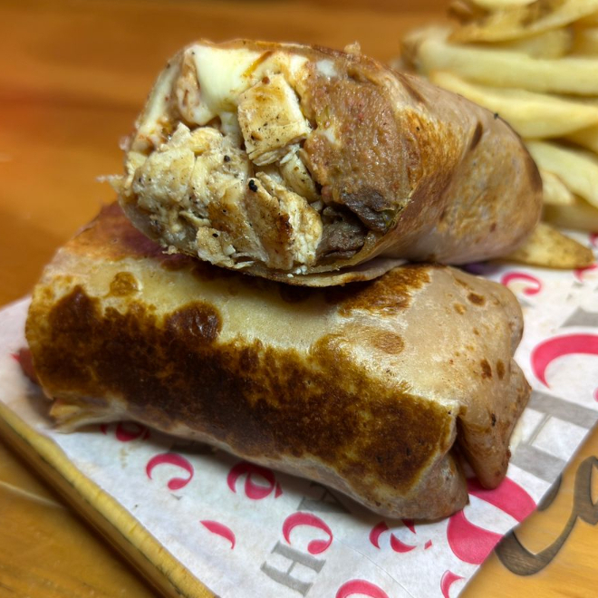 Mega tortilla de harina, con fajita de pollo, queso asadero, base de frijoles refritos, acompañado de papas a la francesa