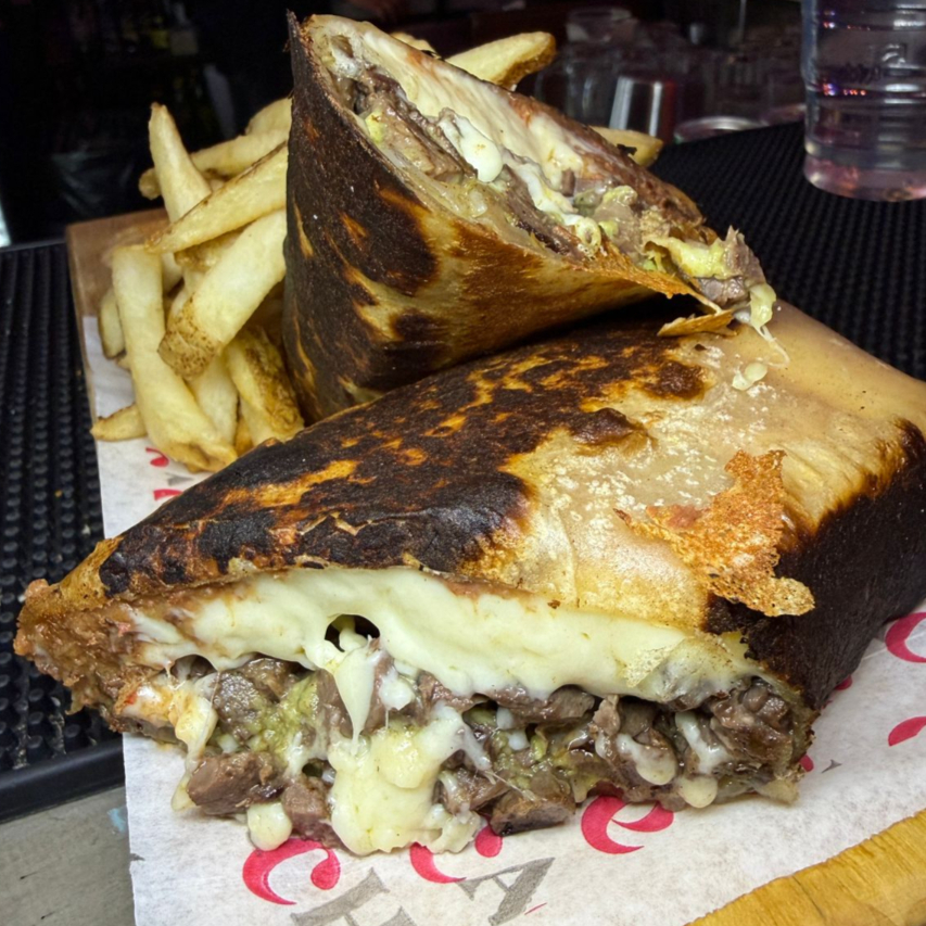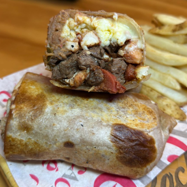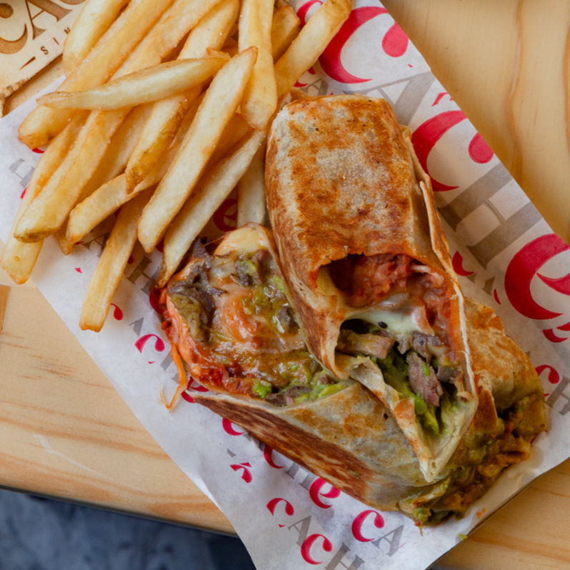 Mega tortilla de harina, con fajita, queso asadero, frijoles refritos, guacamole y cebollas caramelizadas, acompañado de papas a la francesa