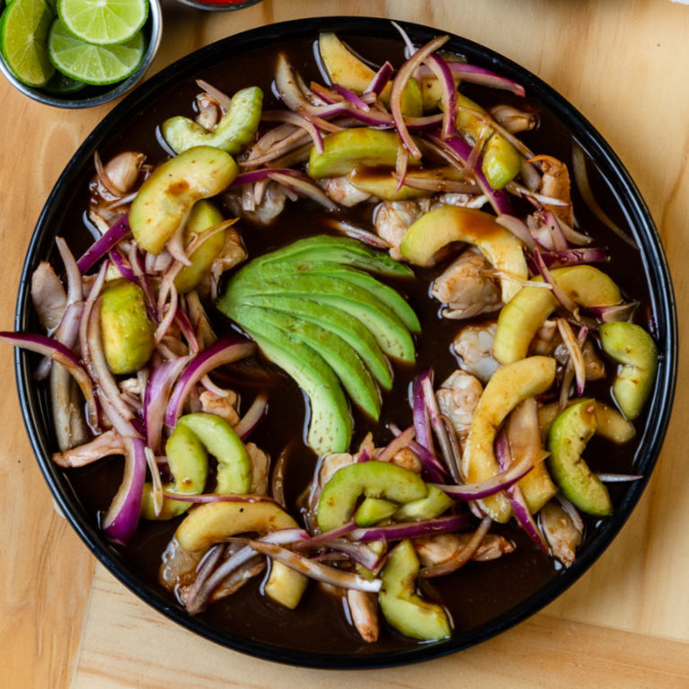 CAMARÓN + SALSAS + CEBOLLA MORADA + PEPINO + AGUACATE