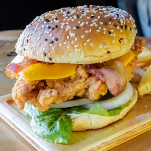 Exquisita pechuga de pollo crunchy, queso amarillo, tocino, lechuga, tomate, cebolla y mayonesa
