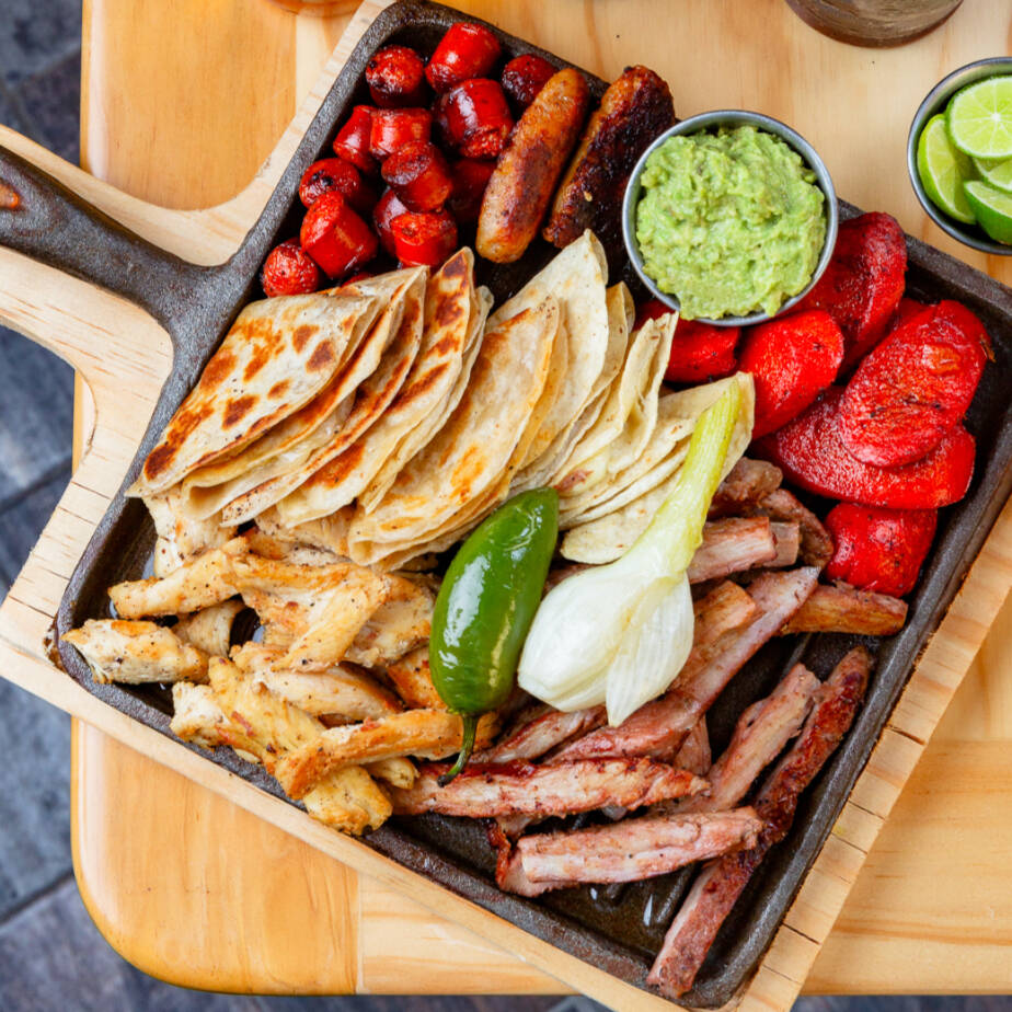 Parrilla caliente con fajitas de res 200g, fajitas de pollo 200g, 6 quesadillas maíz o harina, 2 salchichones, guacamole 100g, cebollitas cambray, y chistorra 150g.