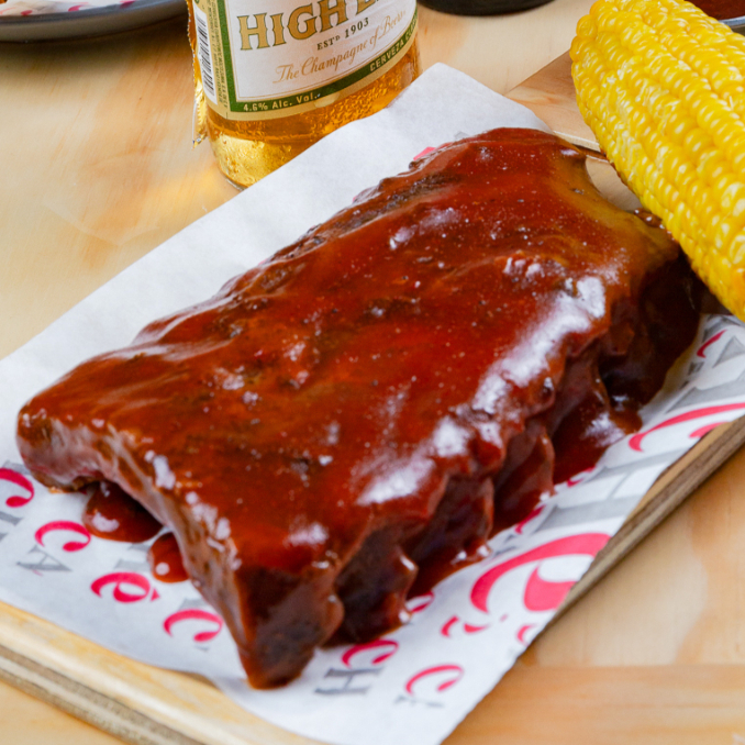 Costillitas de puerco bañadas en salsa BBQ o Chipotle, acompañado de elote amarillo.