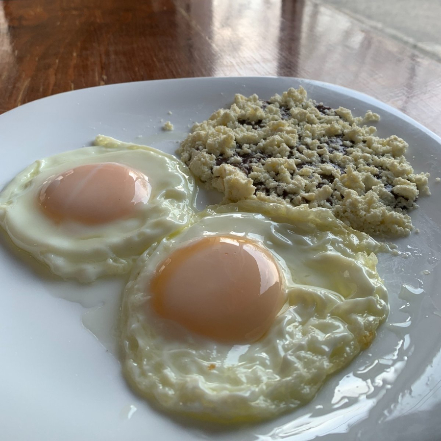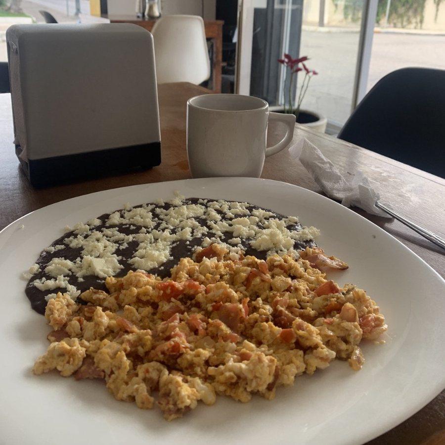 Dos huevos revueltos o estrellados, acompañados de frijoles refritos, queso fresco y tortillas recién hechas con 100% masa de maíz.