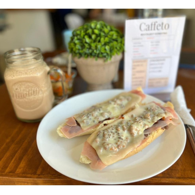 Molletes preparados con frijoles refritos, queso manchego y jamón. Servidos en pan bolillo, acompañados de pico de gallo.