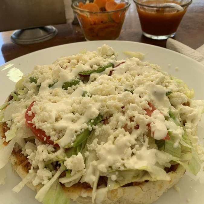 Quesadillas fritas de 100% masa, acompañadas de lechuga, tomate, cebolla, queso, crema y aguacate.