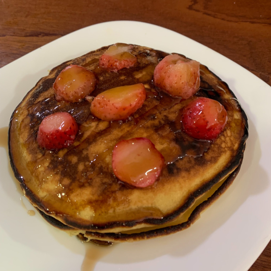 2 Esponjosos pancakes caseros, servidos calientes y acompañados de miel maple. Elige tu topping favorito: fresas o plátano.
