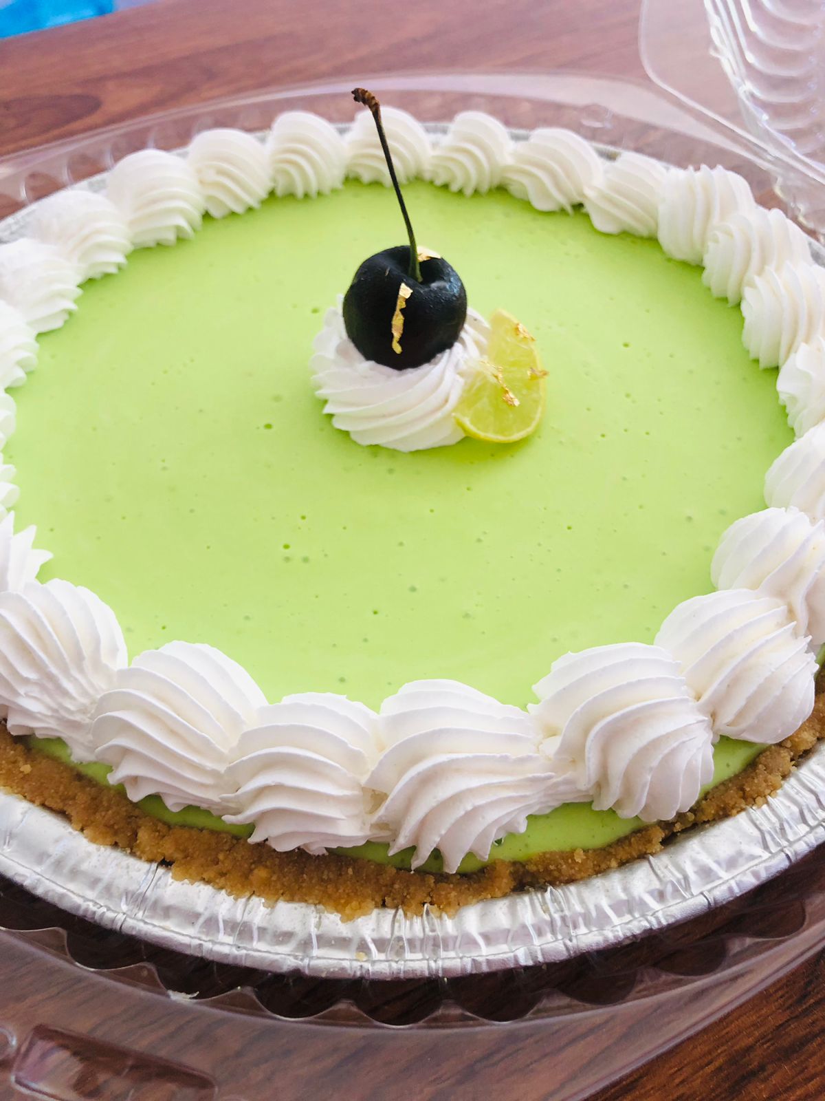 Pay de queso sabor a limón decorado con chantilly y rodajas de limón.