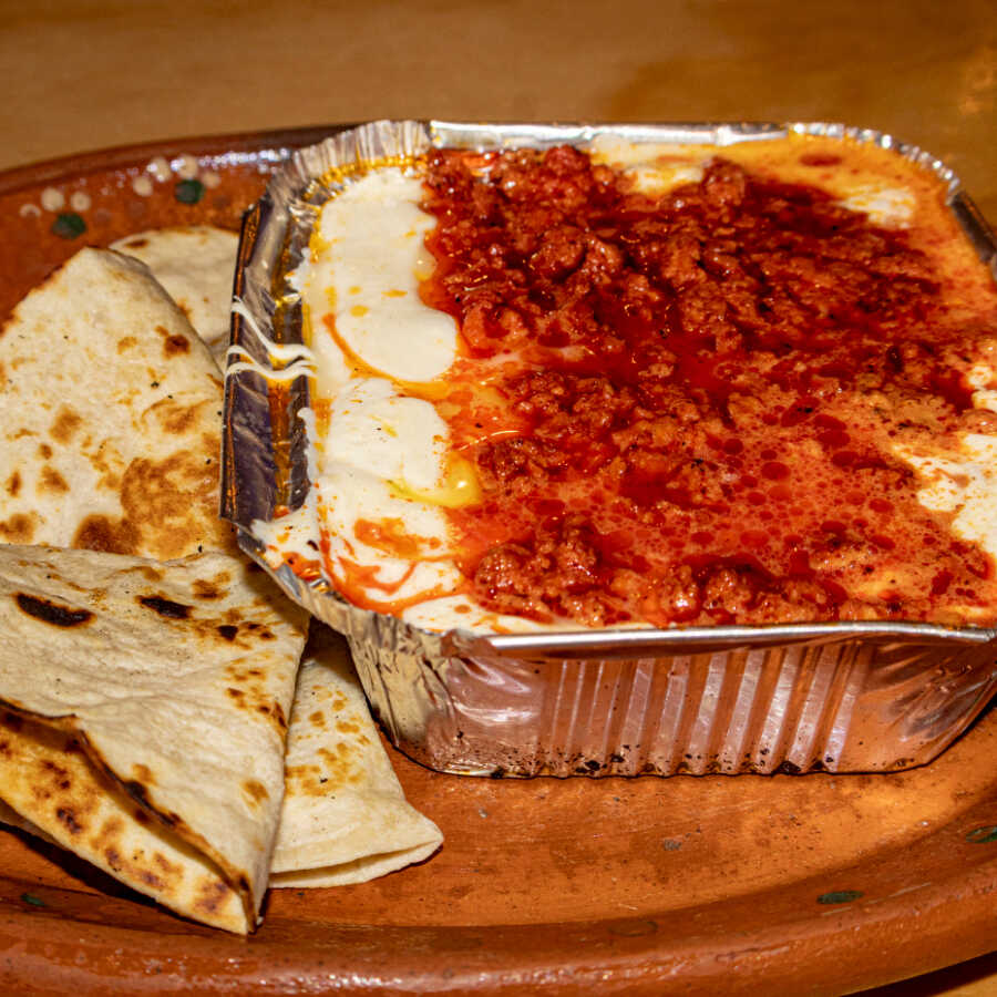 Queso fundido com chorizo, acompañado de tortillas de harina