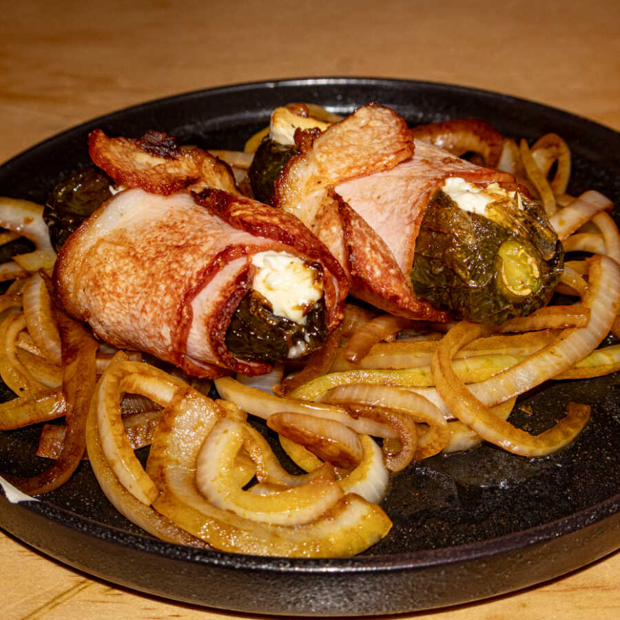 Salchicha de pavo envuelta en tocino, queso asadero, queso mozzarella, tomate, cebolla, salsa BBQ o Búfalo y papas fritas.