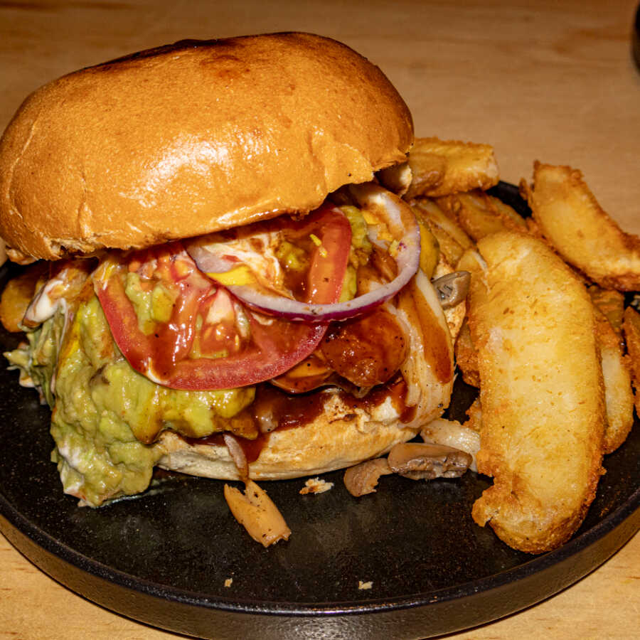 Carne 200 gr., queso asadero, tocino, papas, jalapeños, tomate, cebolla morada, guacamole natural, salsa BBQ y servida en pan grande.