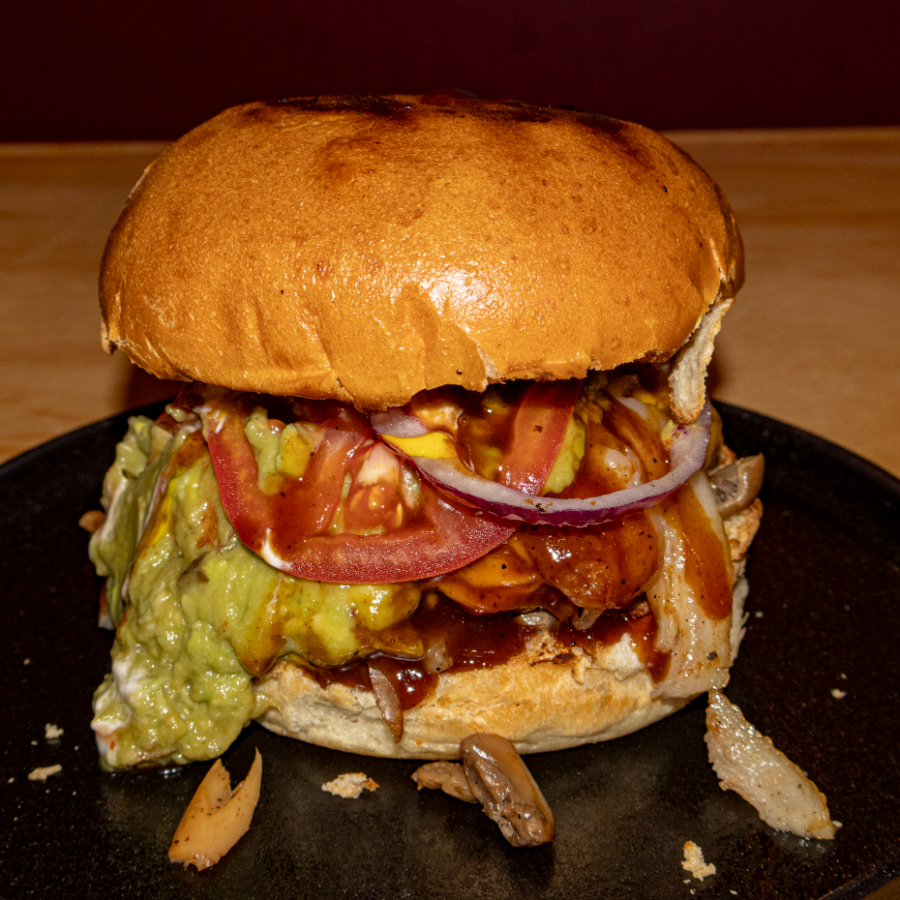 Carne 200 gr., queso asadero, jamón, jalapeños, tomate, cebolla morada, tocino, guacamole natural, salsa BBQ, champiñones y servida e pan grande.