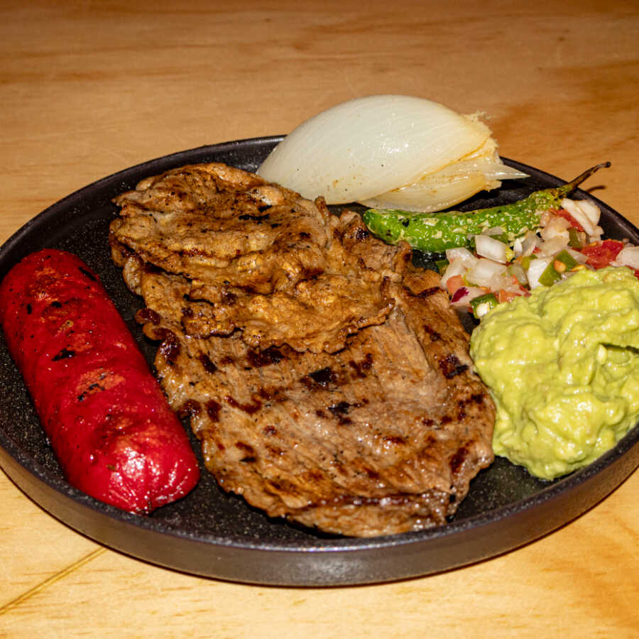 Fajita picada, crema, aderezo de chipotle, guacamole, cebollita asada, papas gajo y friioles charros