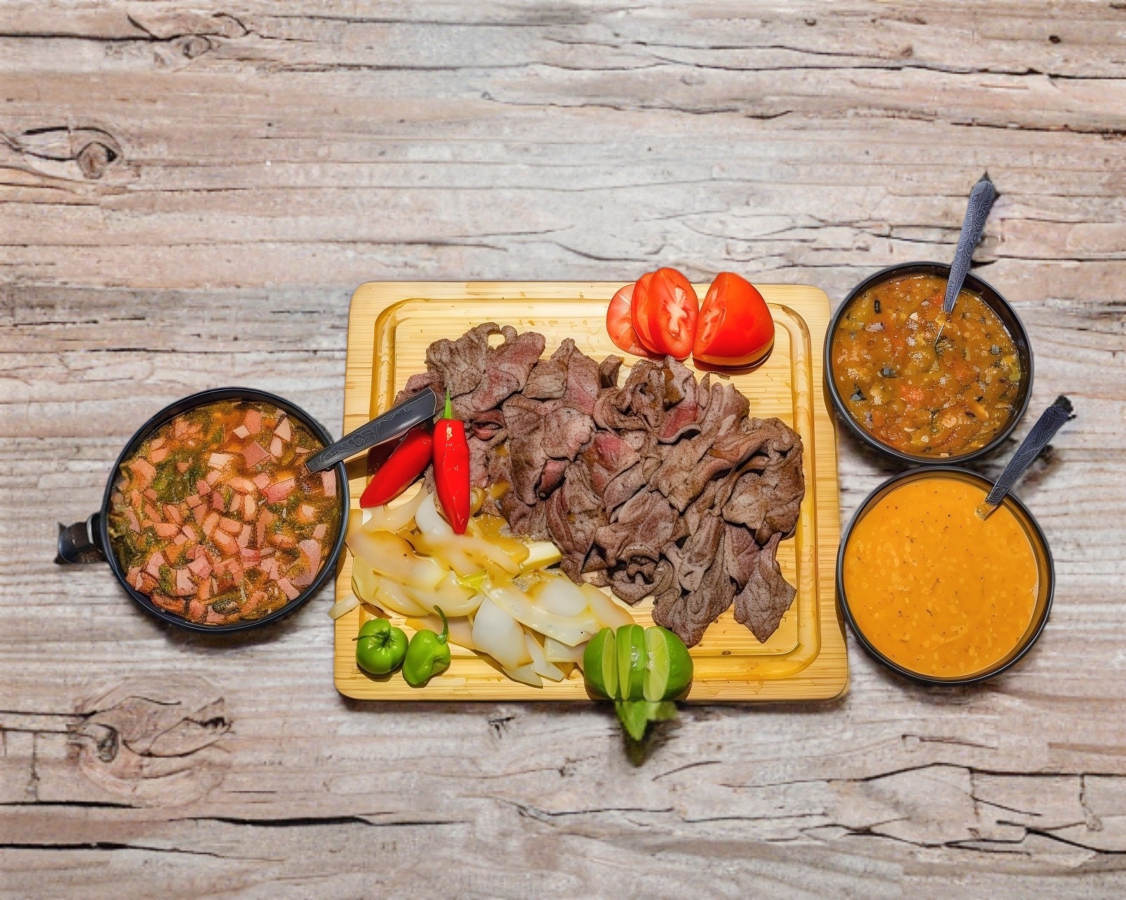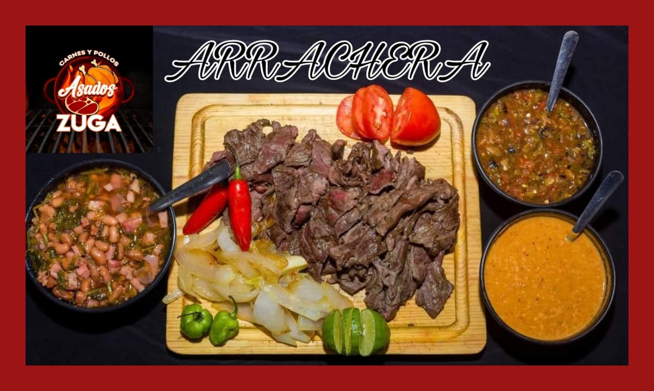 250 GRS DE ARRACHERA, 1/4 LT DE FRIJOL CHARRO, 1 SALCHICHON (2 MITADES) Y 2 QUESADILLAS. INCLUYE: TOSTADAS DESHIDRATADAS, SALSAS, LIMONES Y CEBOLLA ASADA.