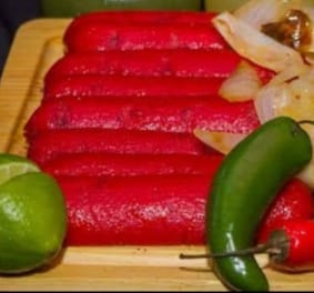 Salchichon relleno de queso envuelto en tocino , guacamole y arrachera, acompañado de papas fritas.