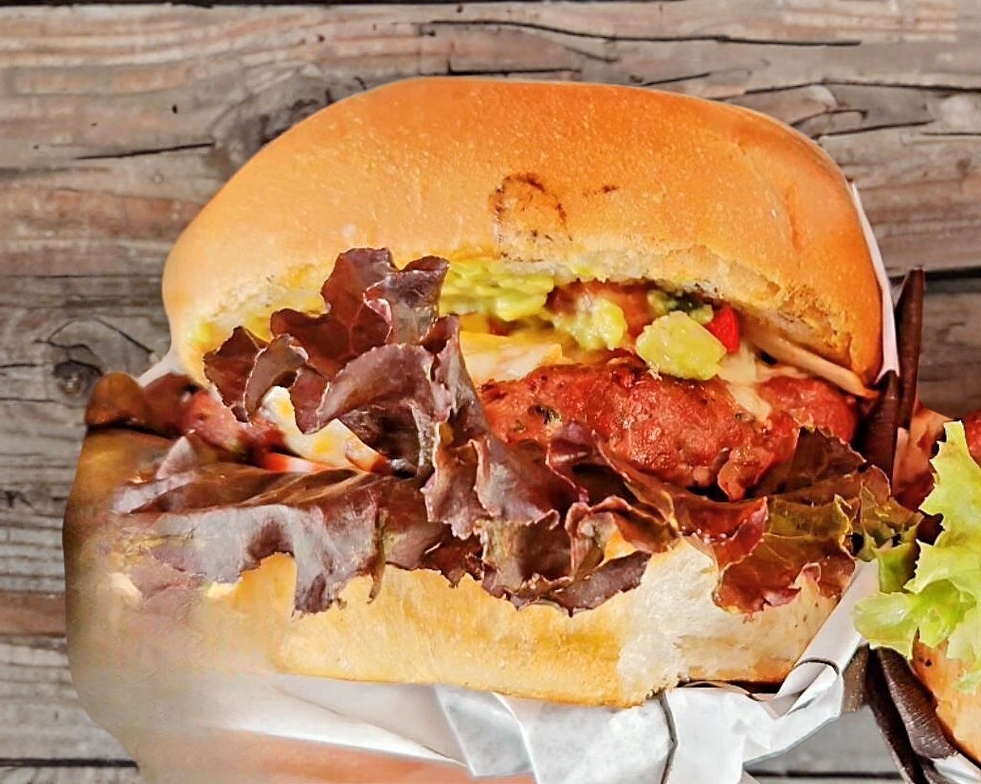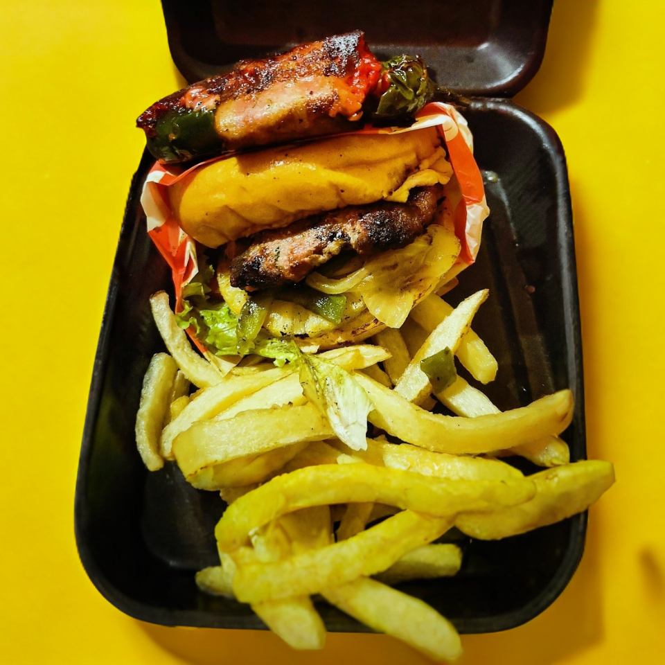 carne res 100% casera ,queso asadero ,piña,lechuga,tomate, mix de cebolla y un chile relleno de choriqueso envuelto en tocino .