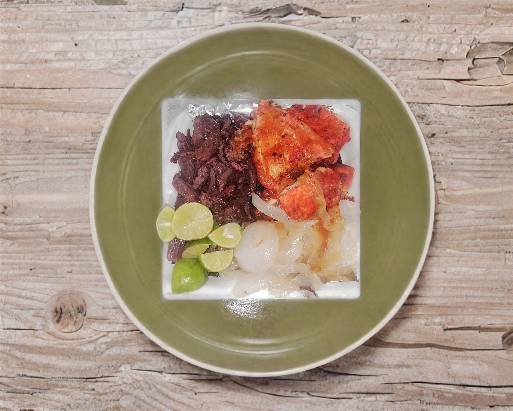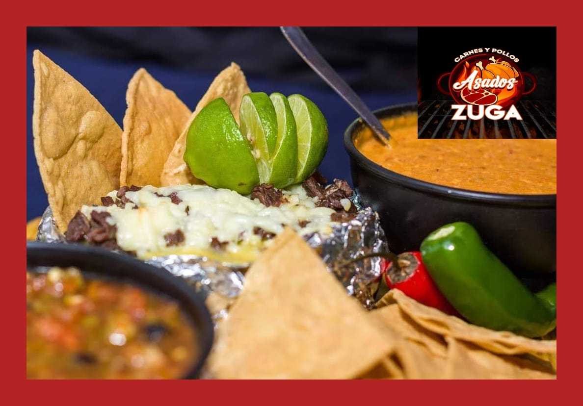 1/2 POLLO, 1/2 KG DE ARRACHERA, 1/2 LT DE FRIJOLES CHARROS. INCLUYE: TOSTADAS DESHIDRATADAS, TORTILLAS, SALSAS, LIMONES Y CEBOLLA ASADA.