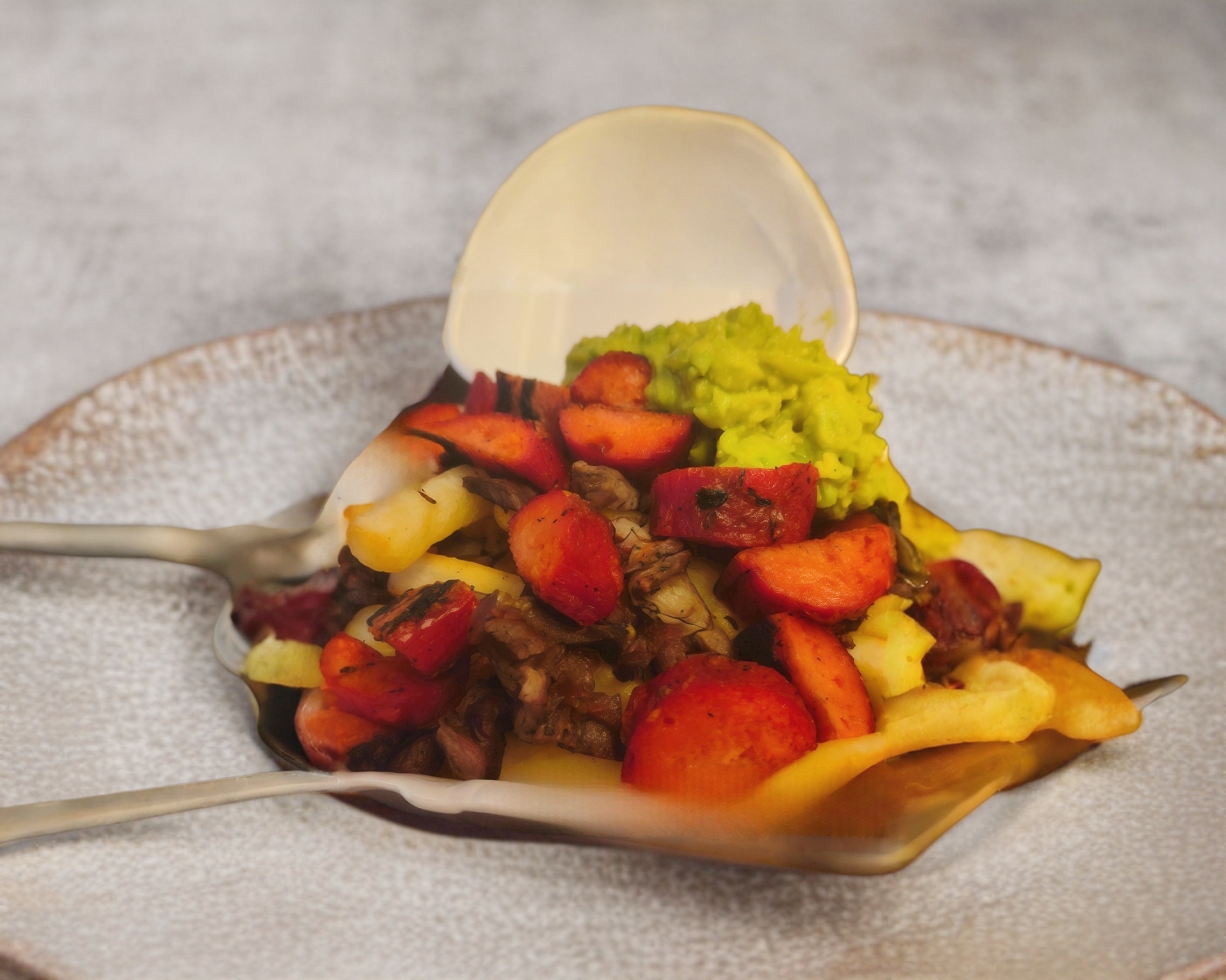Salchichon y papas fritas con arrachera y guacamole con pico de gallo