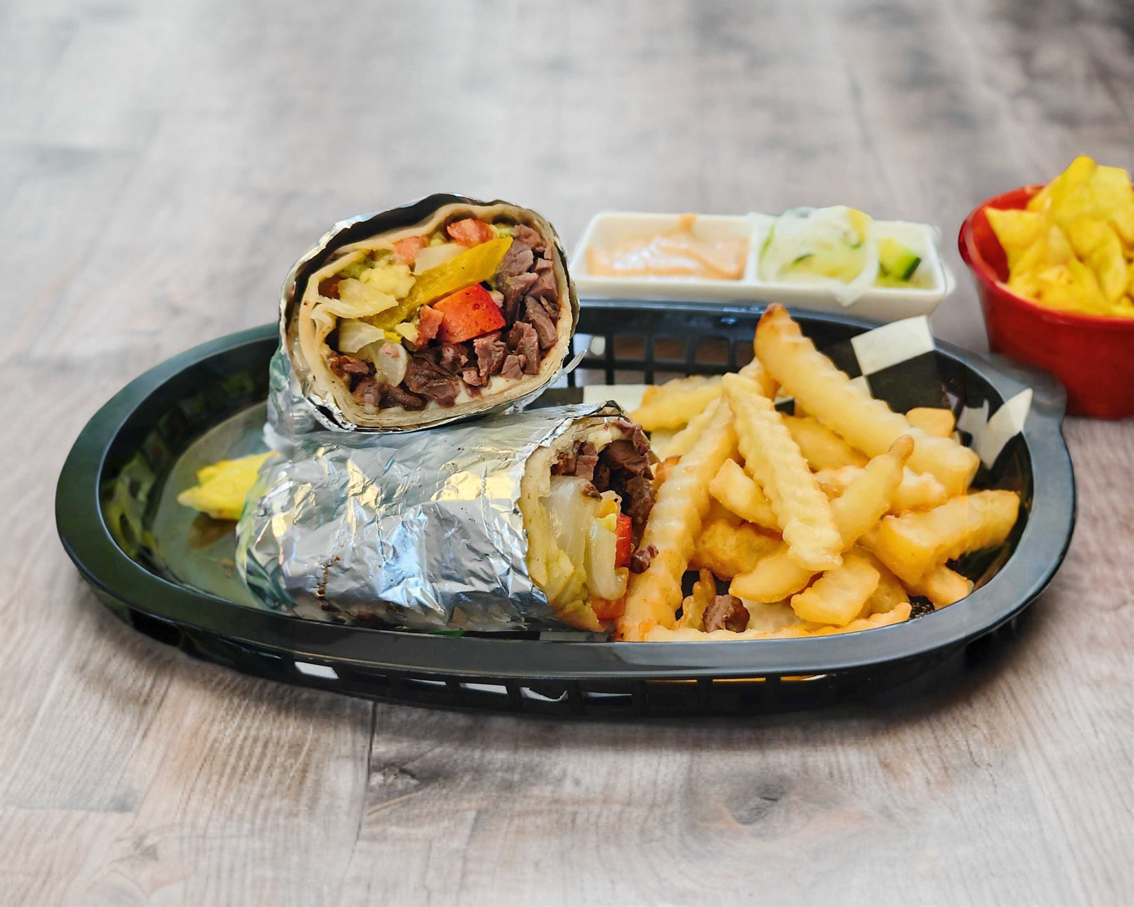 TORTILLA GDE HARINA CON ARRACHERA, QUESO ASADERO MIX DE CEBOLLAS PAPAS FRITAS Y ADEREZO DE LA CASA