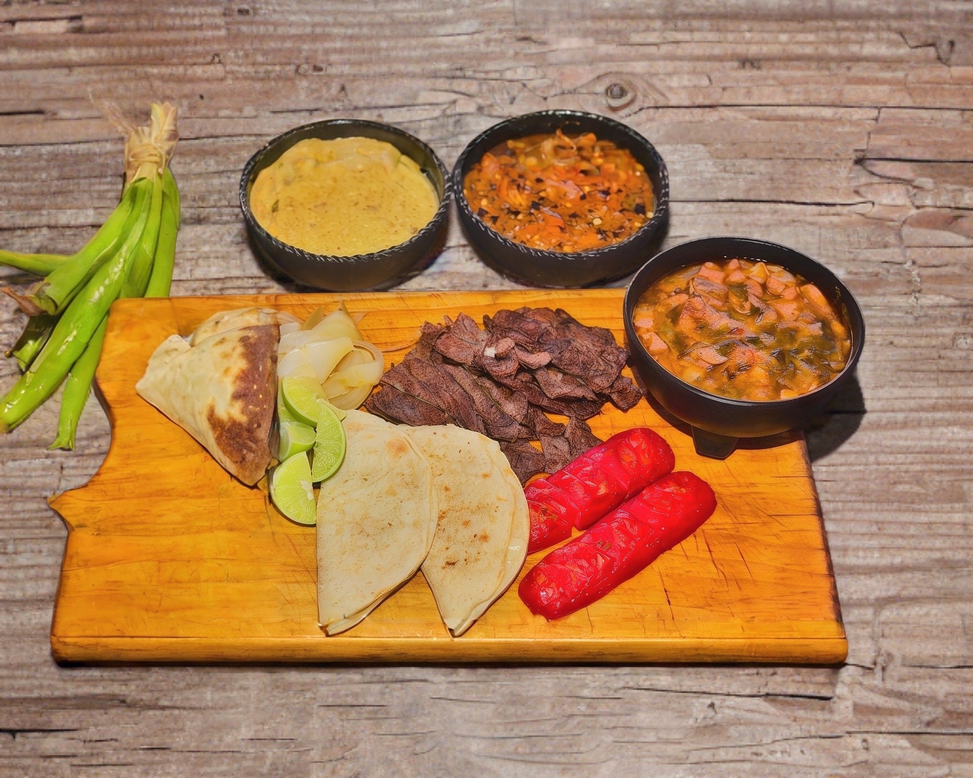 250 gramos de costilla de res , salchichon , 3 quesadillas, frijoles charros,salsas ,limones, tostadas , cebolla asada y tortillaS