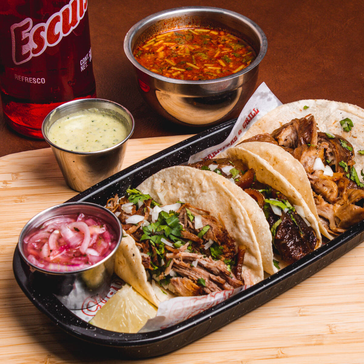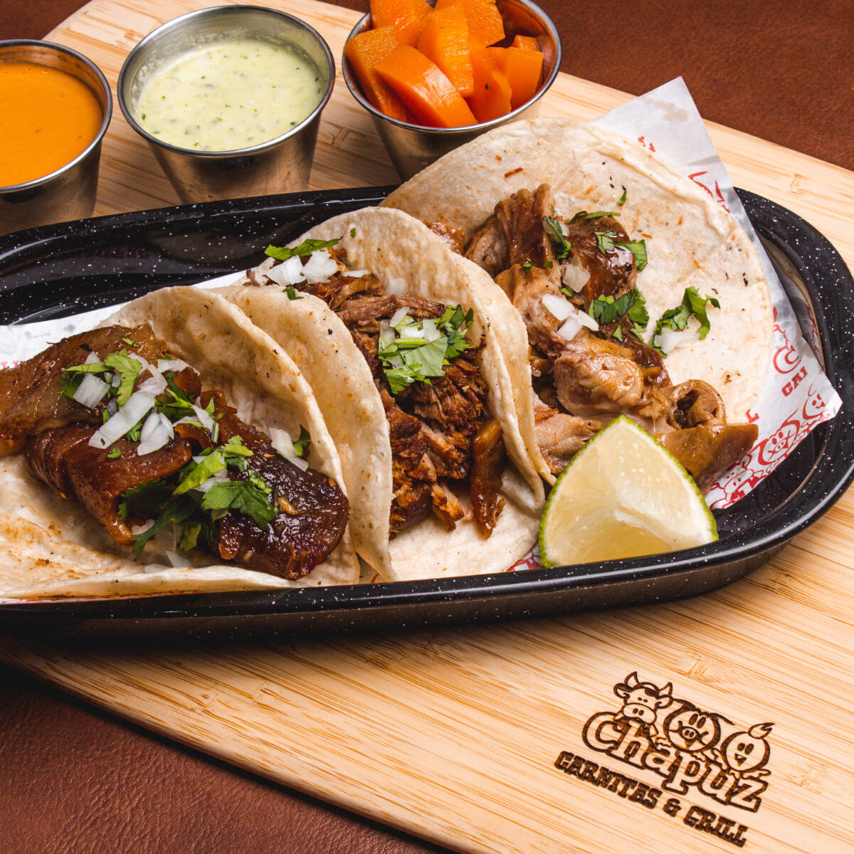 ¼ Frijoles charros, 2 choriquesadillas , verduras a la parrilla , 1 salchichón, 2 guisados ,Salsa , cueritos ,totopos ,tortillas y limones.
