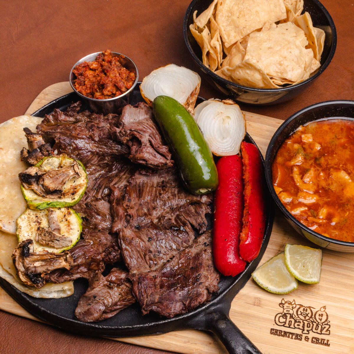 ¼ Frijoles charros, 2 choriquesadillas , verduras a la parrilla , 1 salchichón , 2 guisados ,Salsa , cueritos ,totopos ,tortillas y limones.