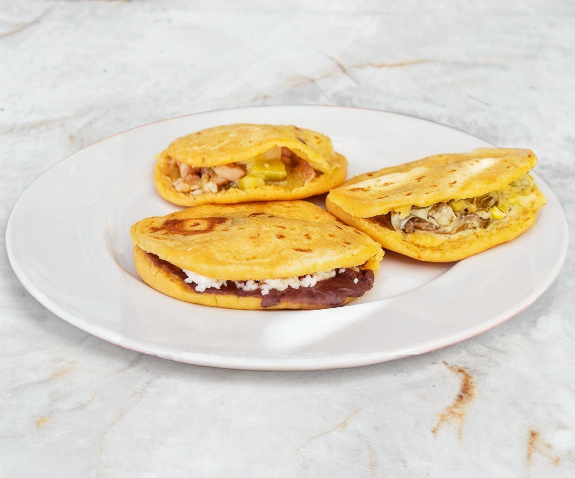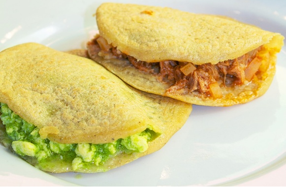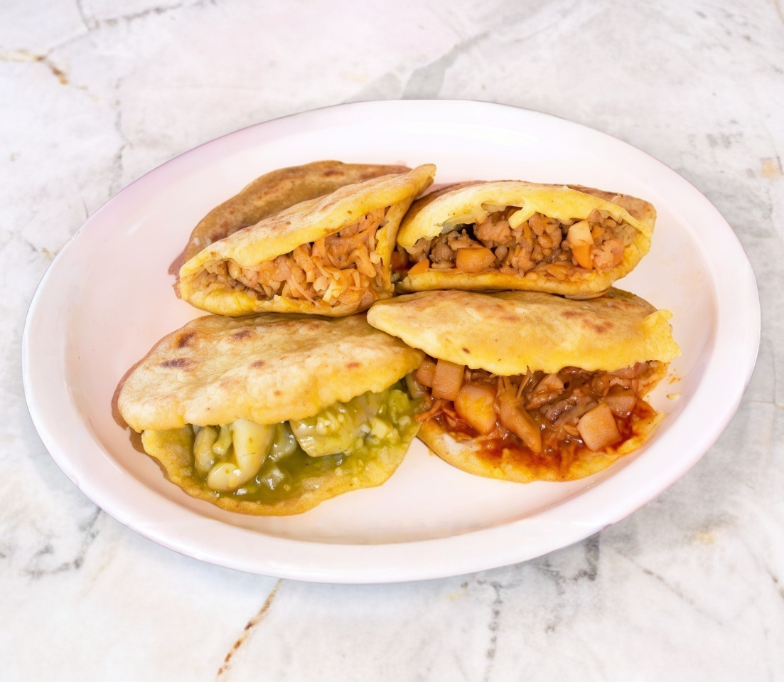 Masa gruesa de maíz rellena con un guiso a elección (como chicharrón prensado, frijoles refritos o carne deshebrada).