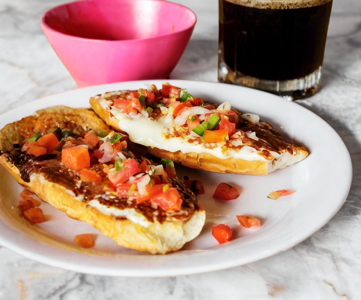 Mitades de bolillo doradas al horno con frijoles refritos, queso fundido encima.
