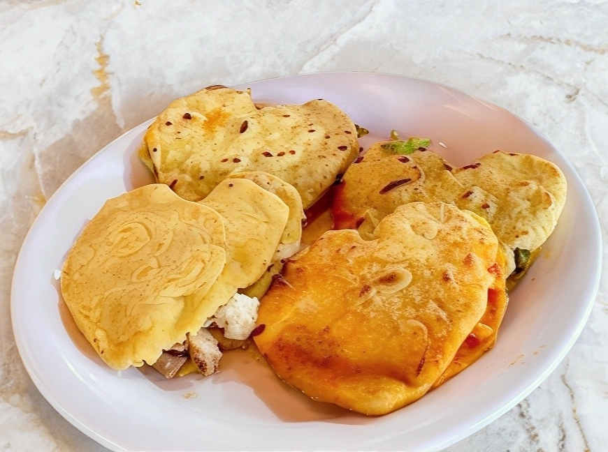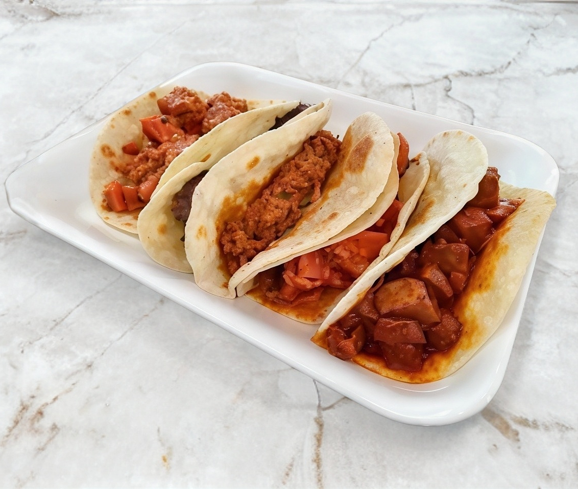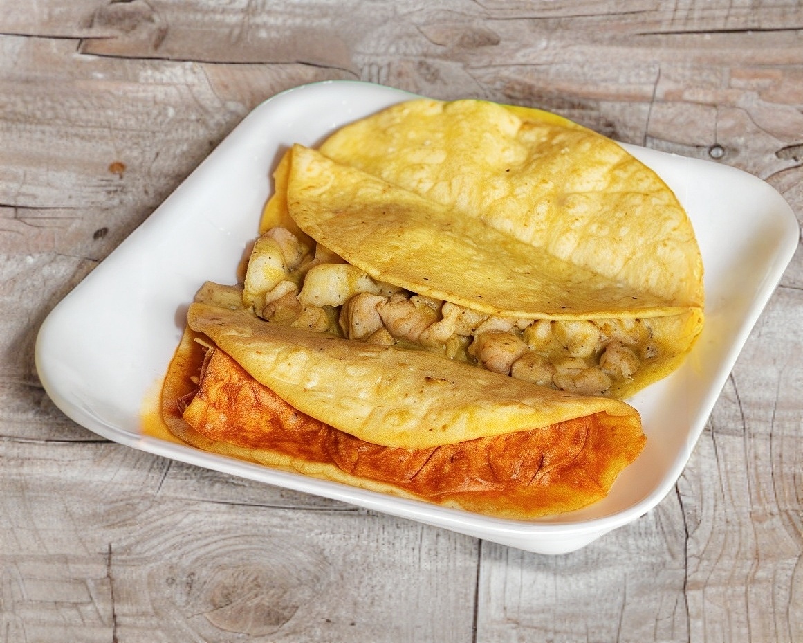 Tortilla de maíz, rellena con el guiso de tu elección (ej. chicharrón, papa con chorizo, rajas con queso). Servido solo o acompañado de cebolla, cilantro y salsa.