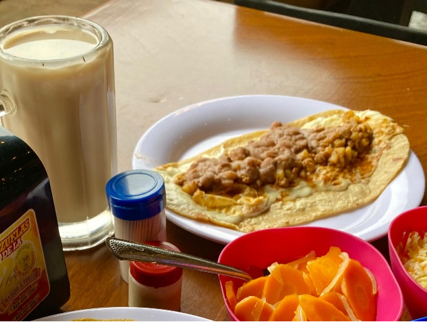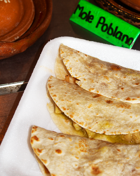 Tortilla de harina, rellena con el guiso de tu elección (ej. chicharrón, papa con chorizo, rajas con queso). Servido solo o acompañado de cebolla, cilantro y salsa.
