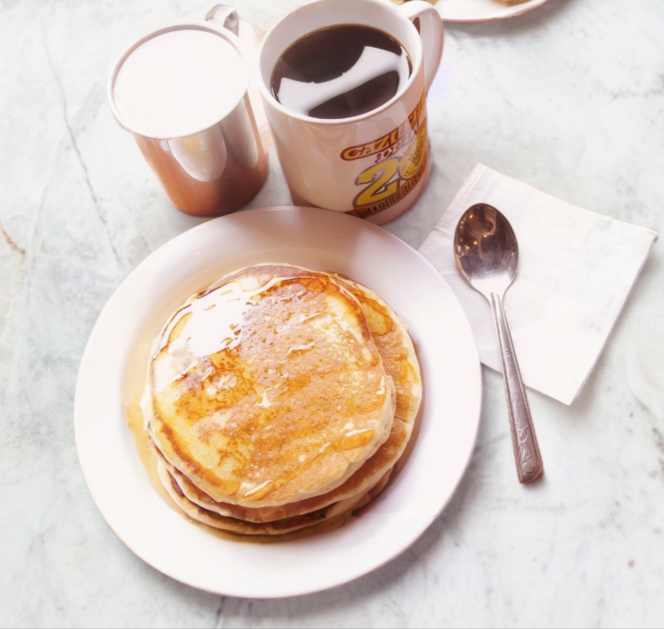 Tres esponjosos hotcakes.