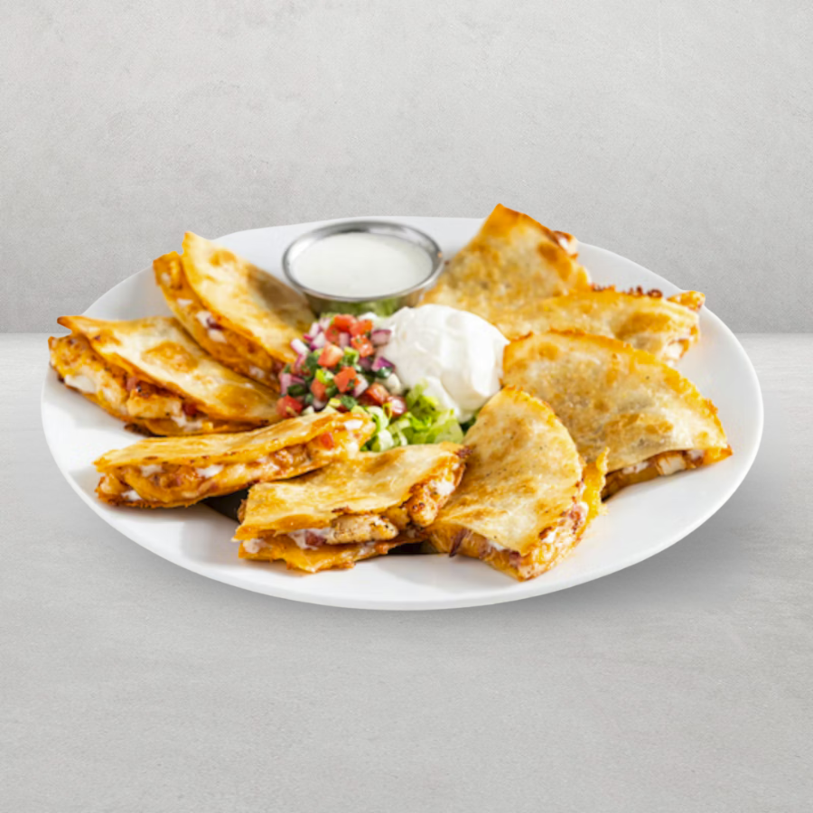 Tortillas de harina con pechuga de pollo asado, tocino ahumado, quesos mixtos y aderezo Ranch. Crema ácida, pico de gallo y aderezo Chipotle Ranch.