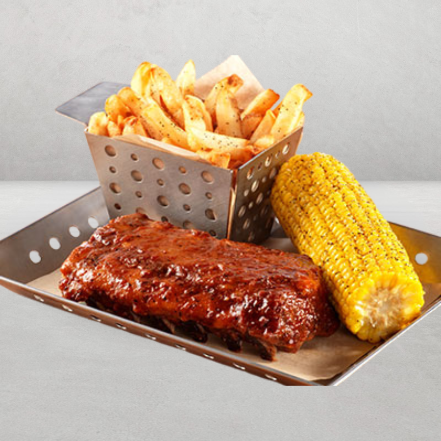 Medio costillar importado, suave y jugoso, acompañado con papas y elote.