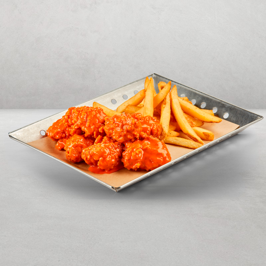Alitas 6 pzs y Boneless 7 pzs bañadas con cualquiera de nuestras salsas ¡tu eliges!, con papas a la francesa, servidas con aderezo Ranch.
