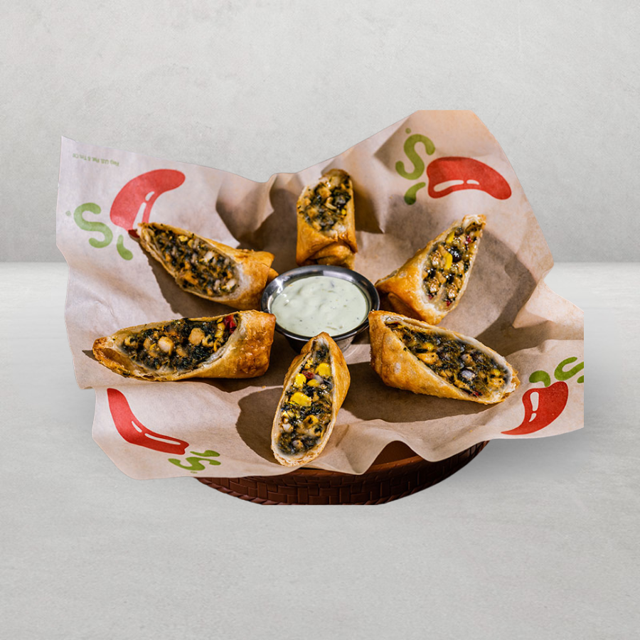 Rollitos de hojaldre rellenos de Pollo ahumado (6), frijoles negros, elote, queso Jalapeño Jack, pimientos rojos y espinacas. Los servimos con aderezo Avocado Ranch.