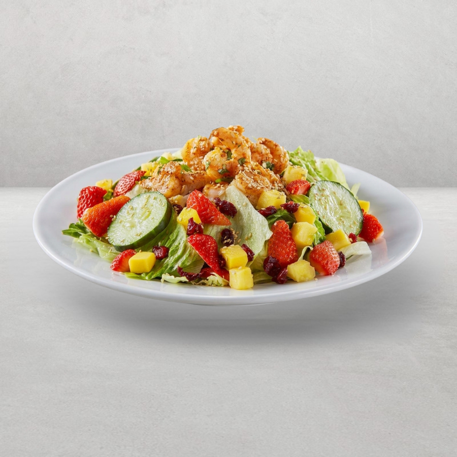 Camarones sazonados (113gr), sobre un mix de lechugas mezclados con aderezo Honey Mustard, fresas, mango, pepino, arándanos y ajonjolí tostado