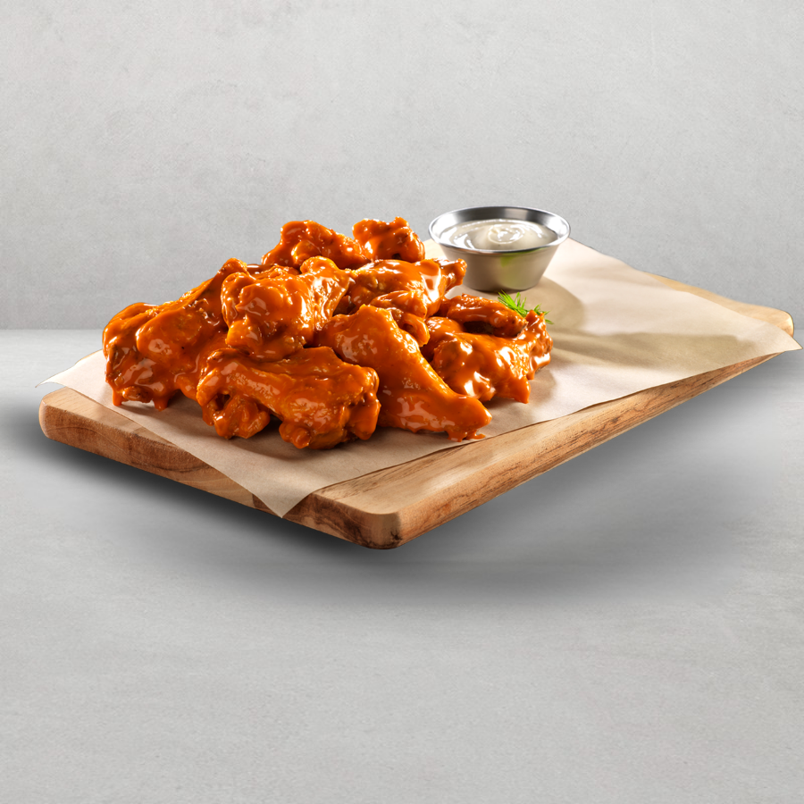 Alitas de pollo bañadas en tu salsa Buffalo favorita y servidas con aderezo Ranch.