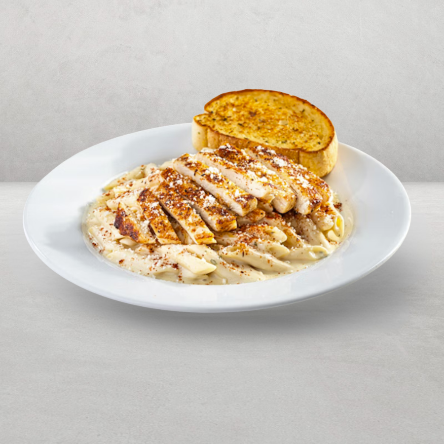 Penne pasta con cremosa salsa Alfredo, tomate picado, queso Parmesano y cebollín. Acompañada con pan de ajo Tostado.