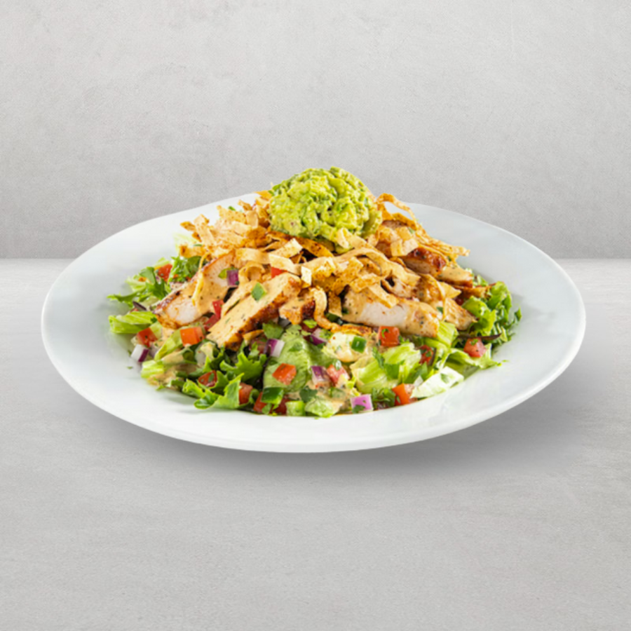 Pollo a la parrilla con condimento Southwest, lechuga, pico de gallo, aguacate, cilantro, tiritas de tortilla y mezclado con aderezo Ranch casero.