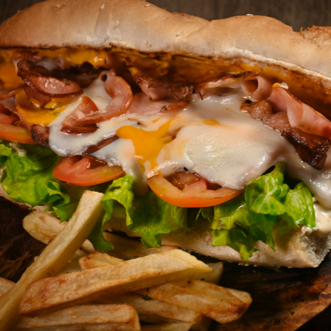 Jamón de pierna a la plancha, queso manchego fundido, intenso sabor de queso cheddar y tocino crujiente. El favorito de la casa.