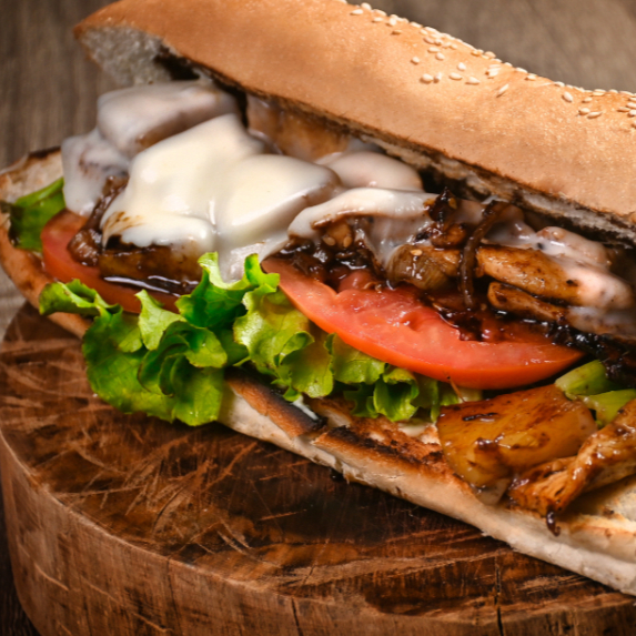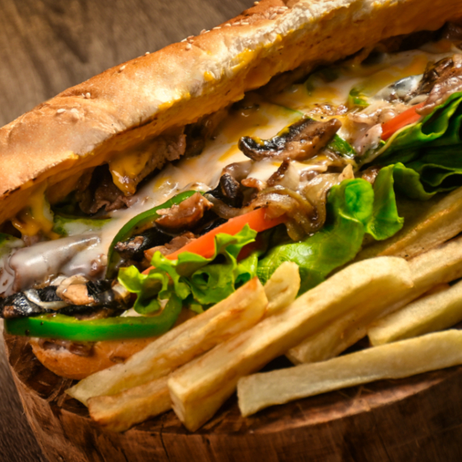 Carne de res sellada a la plancha, con cebolla caramelizada, pimientos, champiñon y abundante queso derretido.