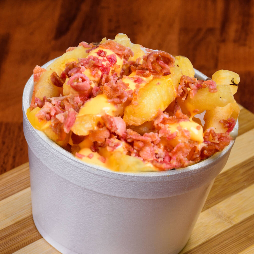 Papas fritas con tocino crujiente, cebolla asada, doble capa de queso (manchego y cheddar). ¡El side más adictivo!