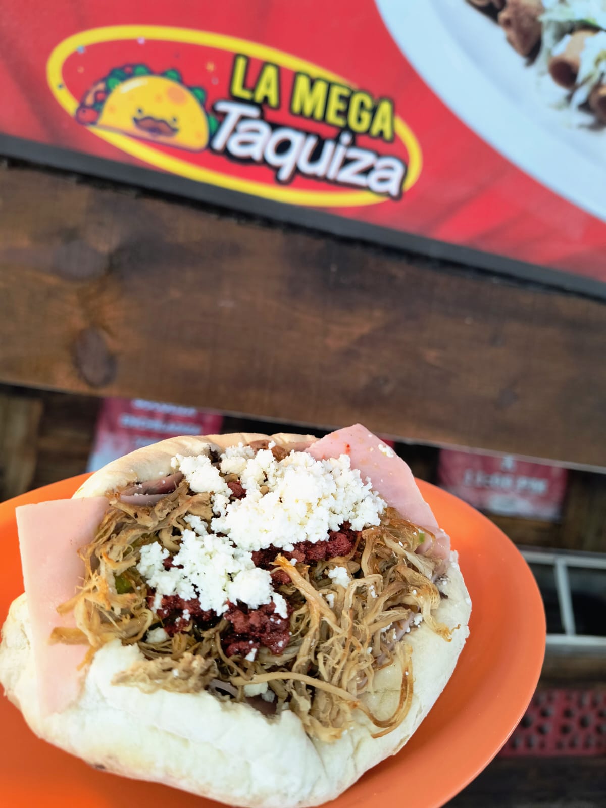 Jamón, Queso puerco, Queso amarillo, Queso blanco Aguacate, Cebolla, Tomate y Carne deshebrada