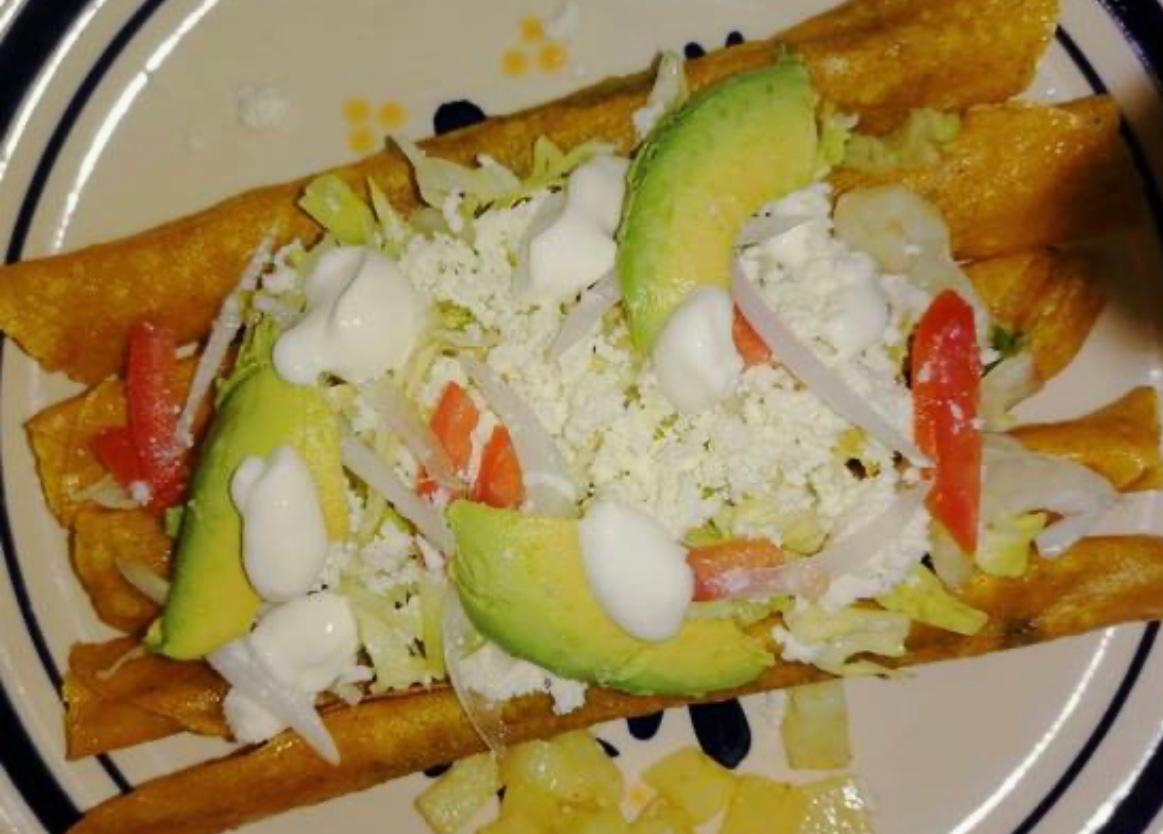 De tortilla amarilla grande, frijol con carne, lechuga, tomate, queso, crema, aguacate y papas.