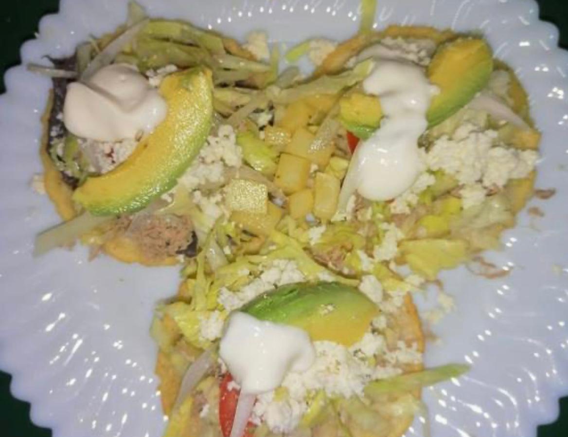 De frijol o papa, carne desebrada, lechuga, tomate, queso, crema, aguacate y papas