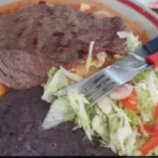 5 pzas De tortillas bañadas en salsa de tomate, servidas con bistec asado, ensalada fresca y frijoles refritos.